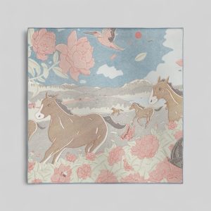 Carriages and horses remained close companions for many years, then, freed from their heavy harness, horses began to slip away. Meanwhile, in this delicate composition, cars reveal their old-fashioned charm and the remarkable craftsmanship that made France one of the world’s most prestigious manufacturing hubs. In colorful crests or in the center of the scarf, open carriages, elegant coupes, sedans and high-perched phaetons all testify to the sophistication of an entire era.