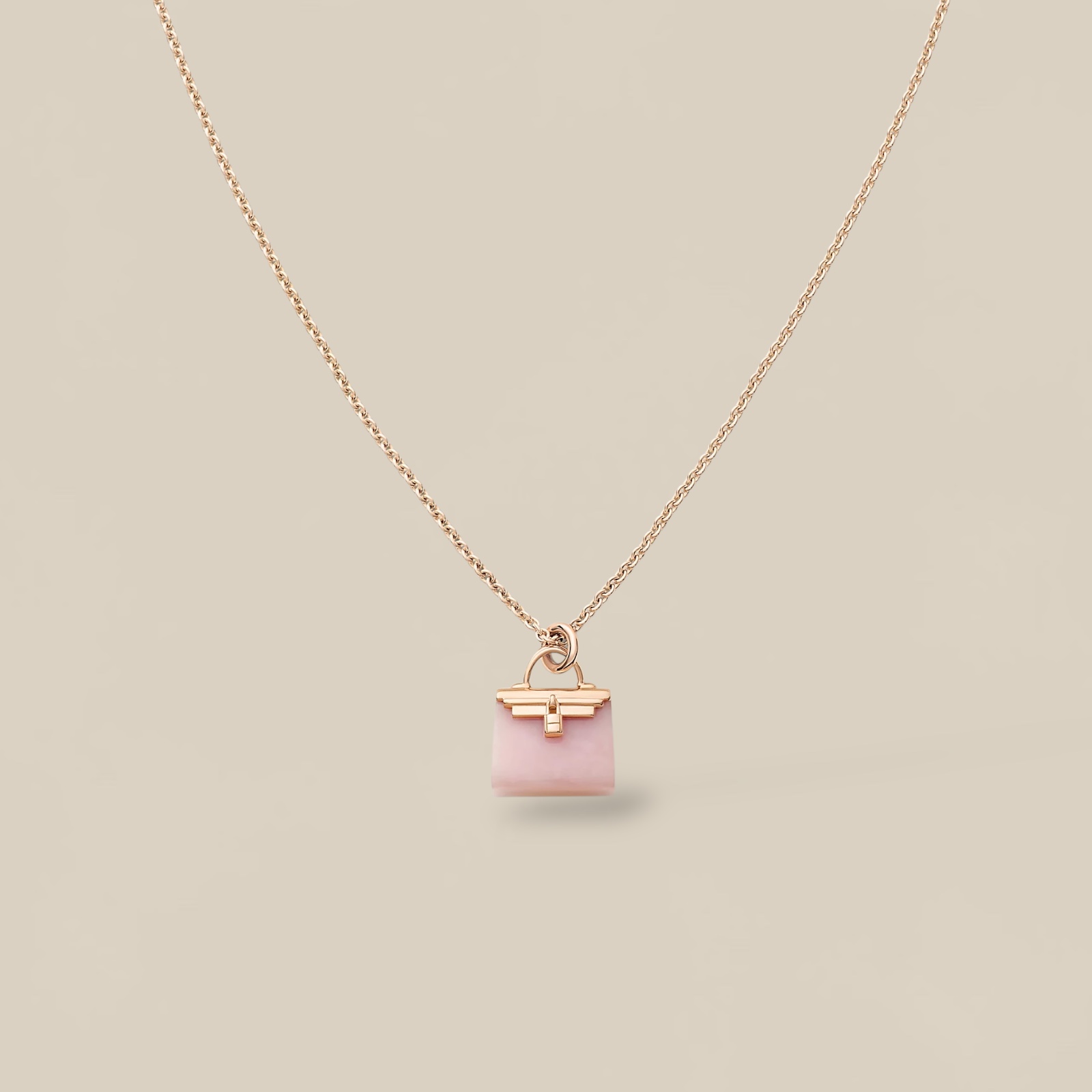 Long necklace in rose gold set with one pink opal gemstone and Kelly snap closure