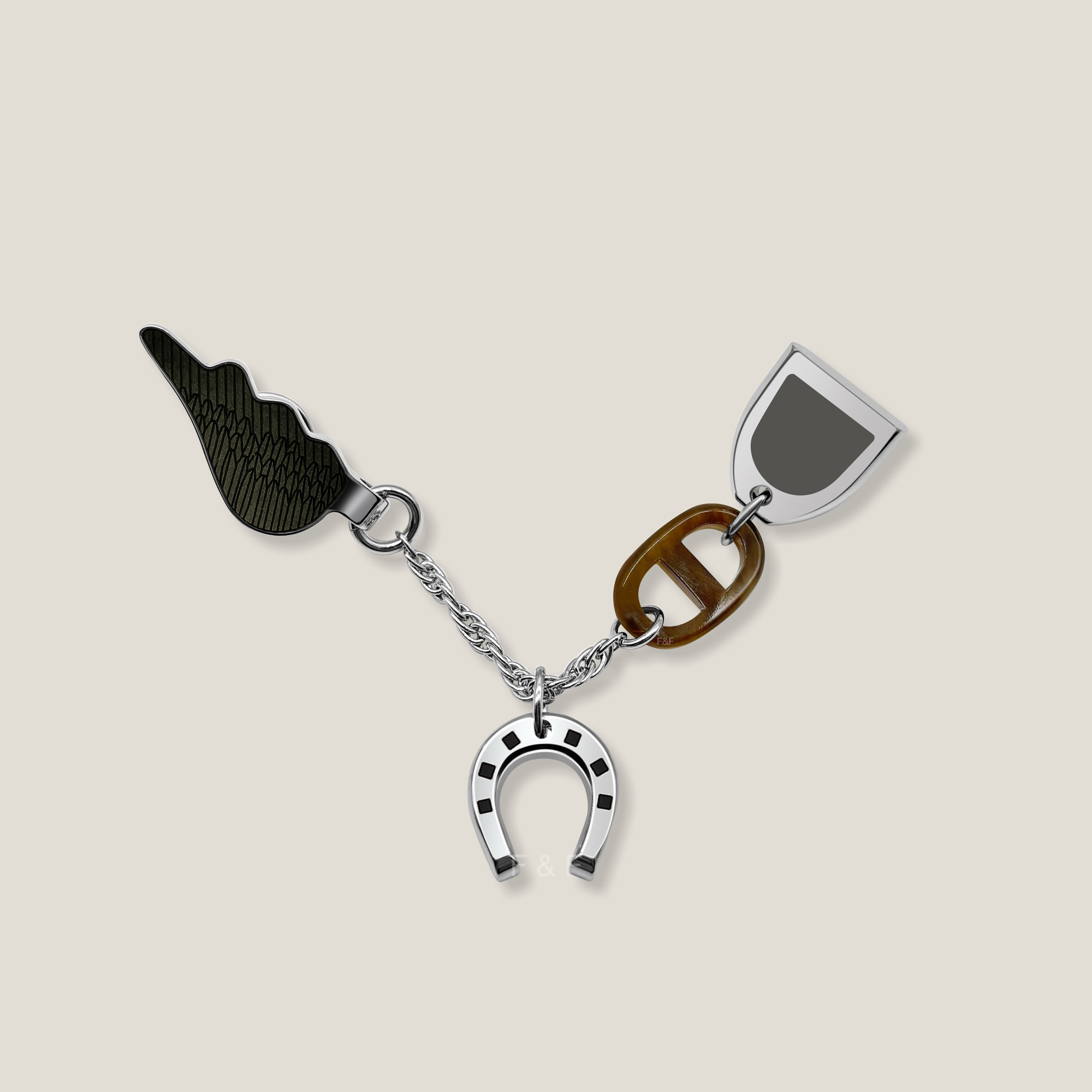 The Bon Voyage brooch is a contemporary reinterpretation of the protective medallions for travelers. Symbolizing luck, it has four elements representing the world of travel. Worn on the lapel of a jacket or the collar of a shirt, this chain brooch offers a multitude of different wearing styles and adds a touch of elegance to any outfit.