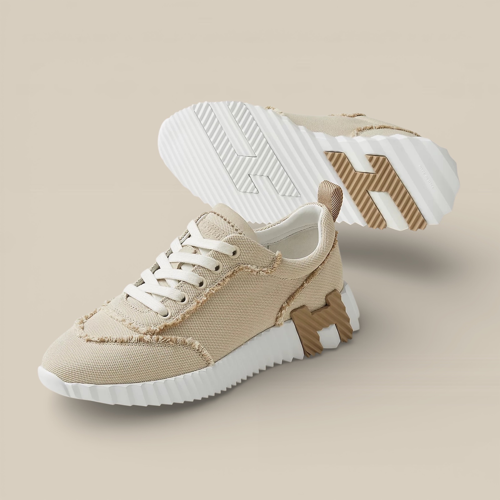Sneaker in fringed H canvas and suede goatskin. Light sole with contrasting design for a versatile and modern look. A second pair of shoelaces is included.