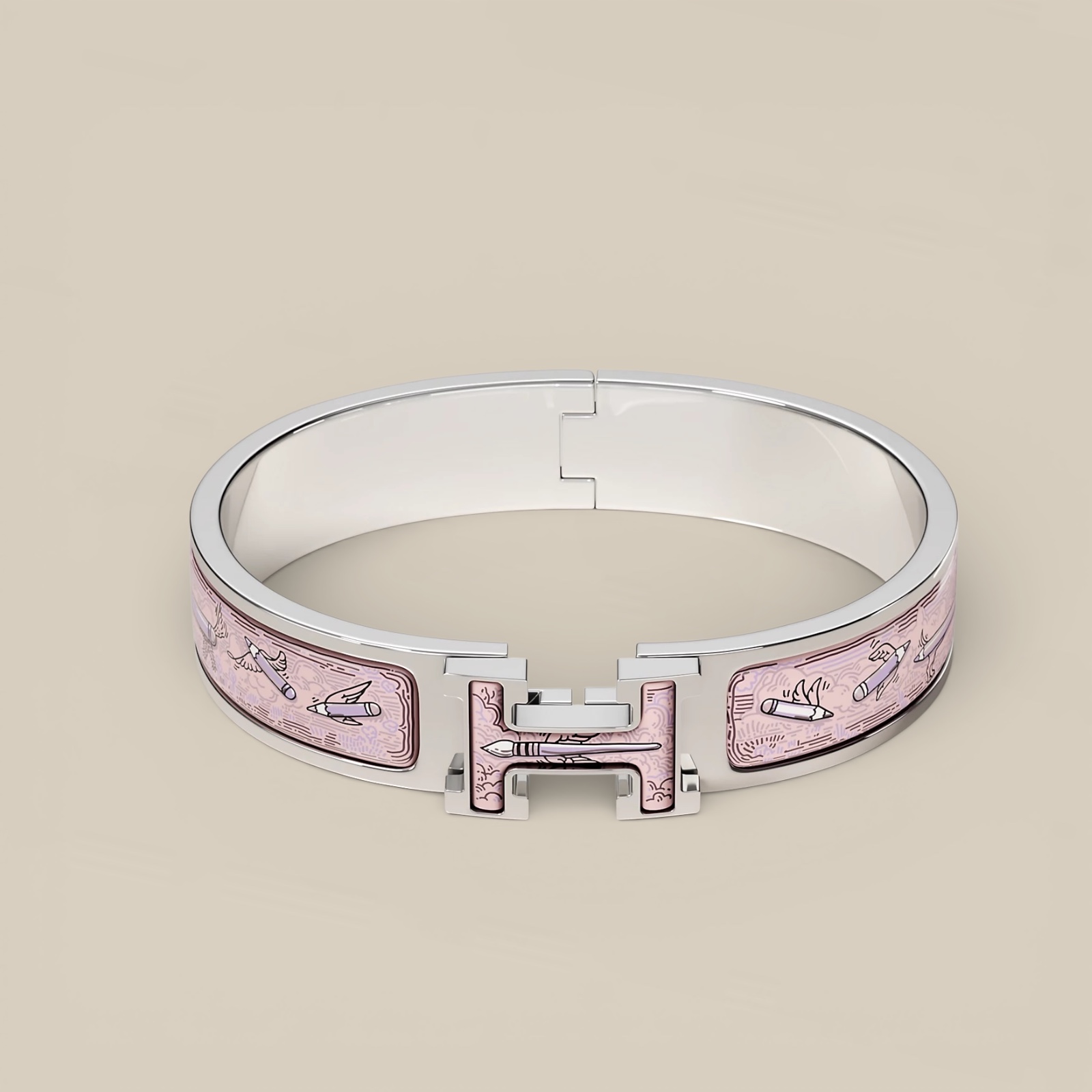 Narrow bracelet in “Les Outils du Dessin” printed enamel, design by Dimitri Rybaltchenko.