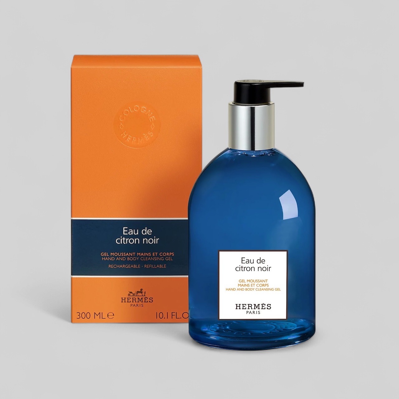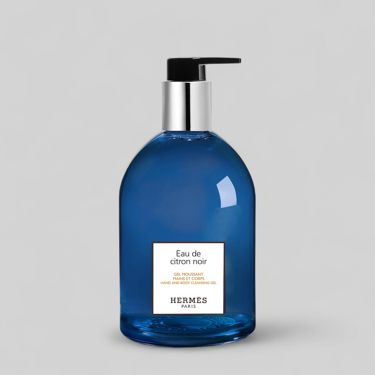The rounded lines of the bottle are embellished with a radical deep blue, emblematic of Eau de citron noir, and two Clou de Selle details one as an imprint of the base and one engraved on the pump.