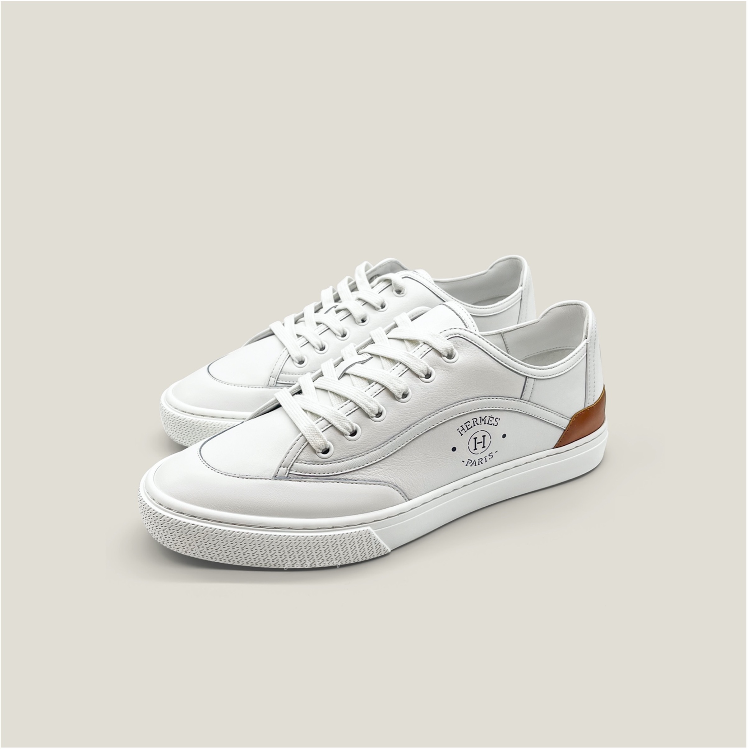 Sneaker in calfskin with signature “Hermès Paris” stencil. For the perfect modern look. A second pair of strings is included.