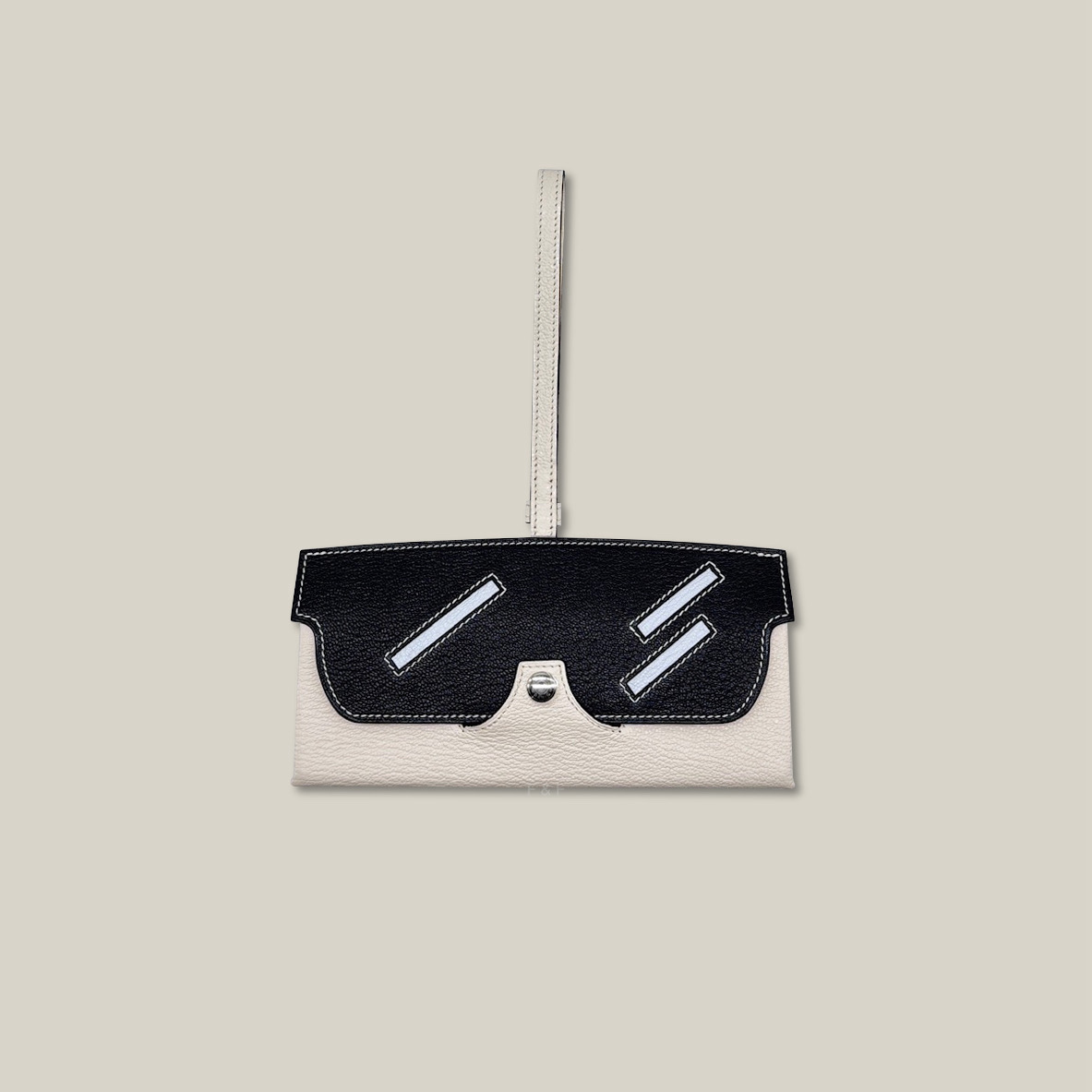 Glasses case in Mysore goatskin with removable lanyard, front reinforced with metal plate, openwork leather patches, “Hermes Sellier” silver threaded on spherical leather patch and snap closure forming the face’s nose