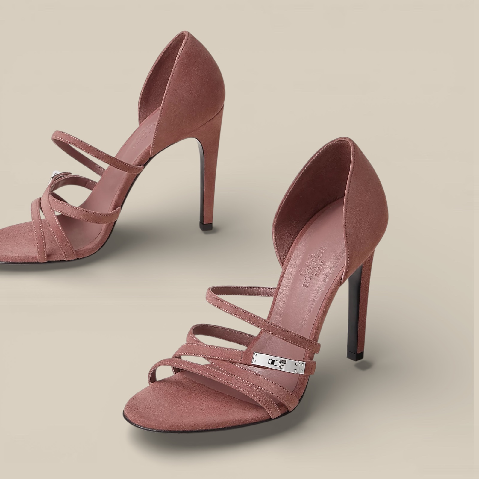 High heel sandal in suede goatskin with iconic Kelly buckle reinterpreted in a mini version.