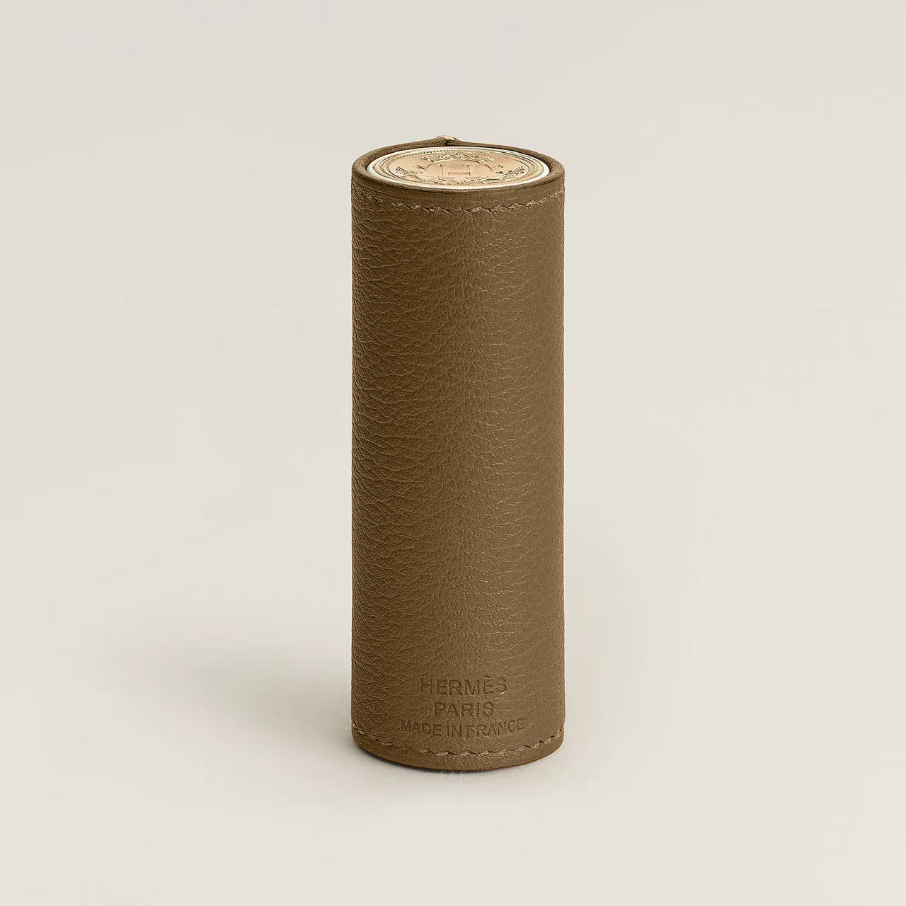 A perfect complement to the Rouge Hermès collection, the lipstick case is made of supple Evercolor calfskin with a regular grain and satin feel. 27 hand-sewn saddle stitches, in a beige color, secure the object, which is embossed with the signature “Hermès Paris Made in France”. A Rouge Hermès lipstick slides perfectly into this leather case lined with Chagrin goatskin.