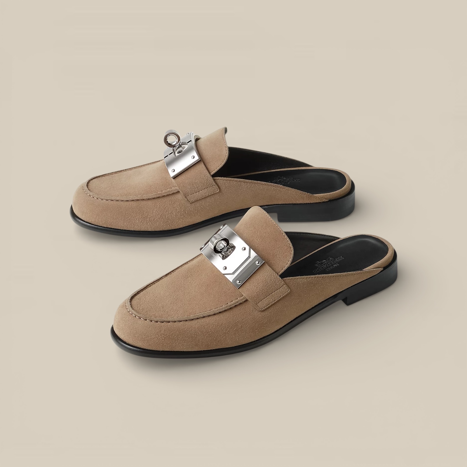 Mule in suede goatskin or calfskin with iconic oversized Kelly buckle. For a casual modern look.