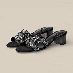 High heel sandal in suede goatskin with iconic “H” cut-out detail and “Figure Artistique” inspired rhinestone motif.