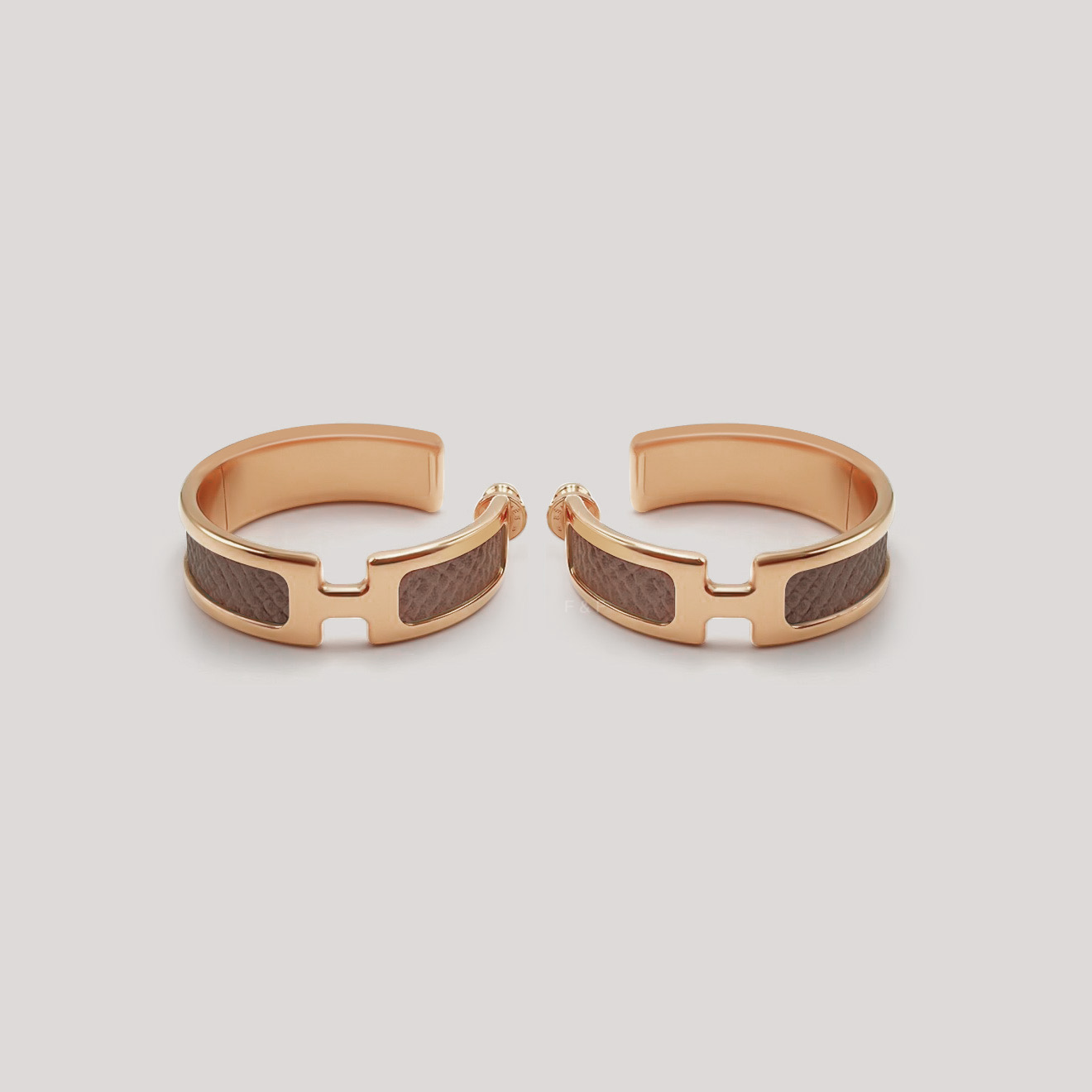 Earrings in Box calfskin. The Olympe earrings, inspired by a piece dating back to 1970, reveal a discreet “H” in its center.