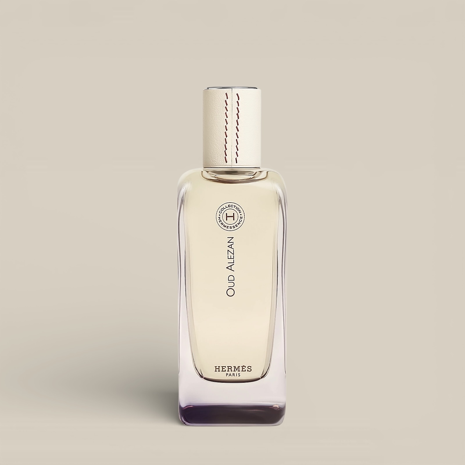 The bottle is showcased by a plum-brown-colored lacquer on the glass, contrasting with the chalk-colored leather adorning the cap.