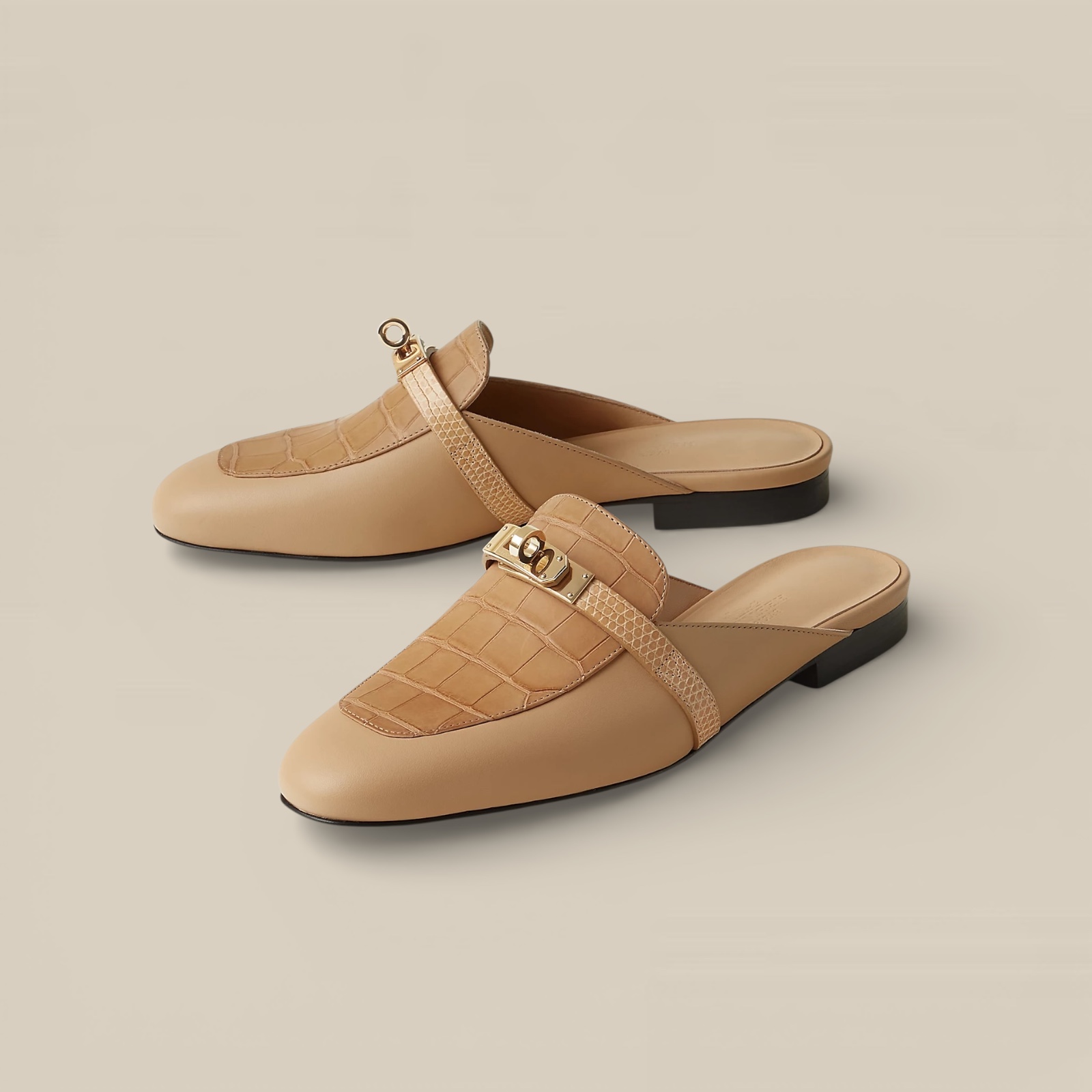 Mule in calfskin, matte crocodile leather and shiny Java lizard with iconic permabrass-plated Kelly buckle. For everyday elegance.