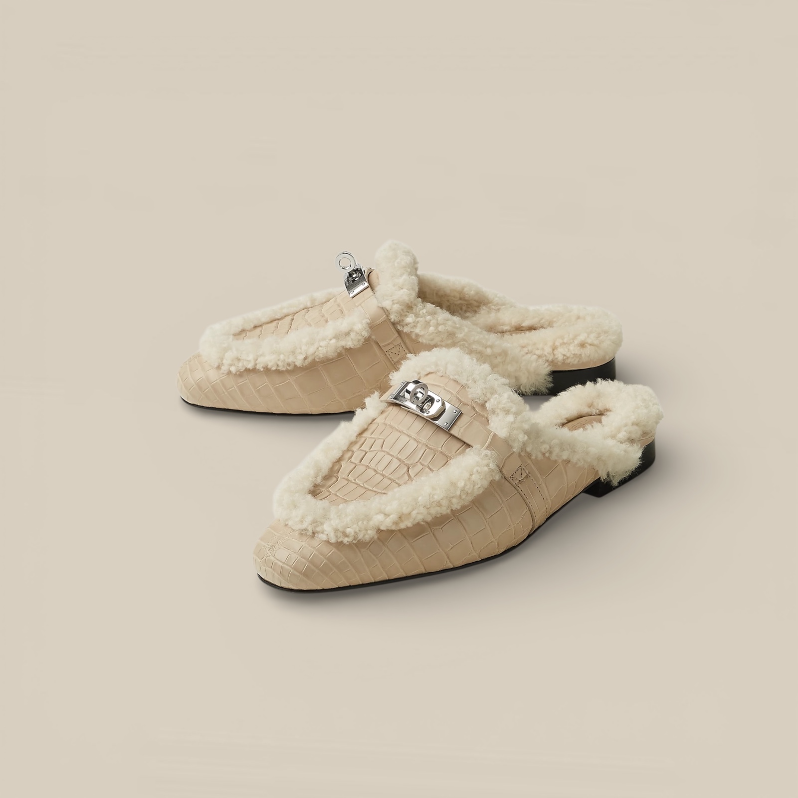 Mule in matte Mississippiensis alligator and shearling with iconic palladium-plated Kelly buckle. For a chic style.
