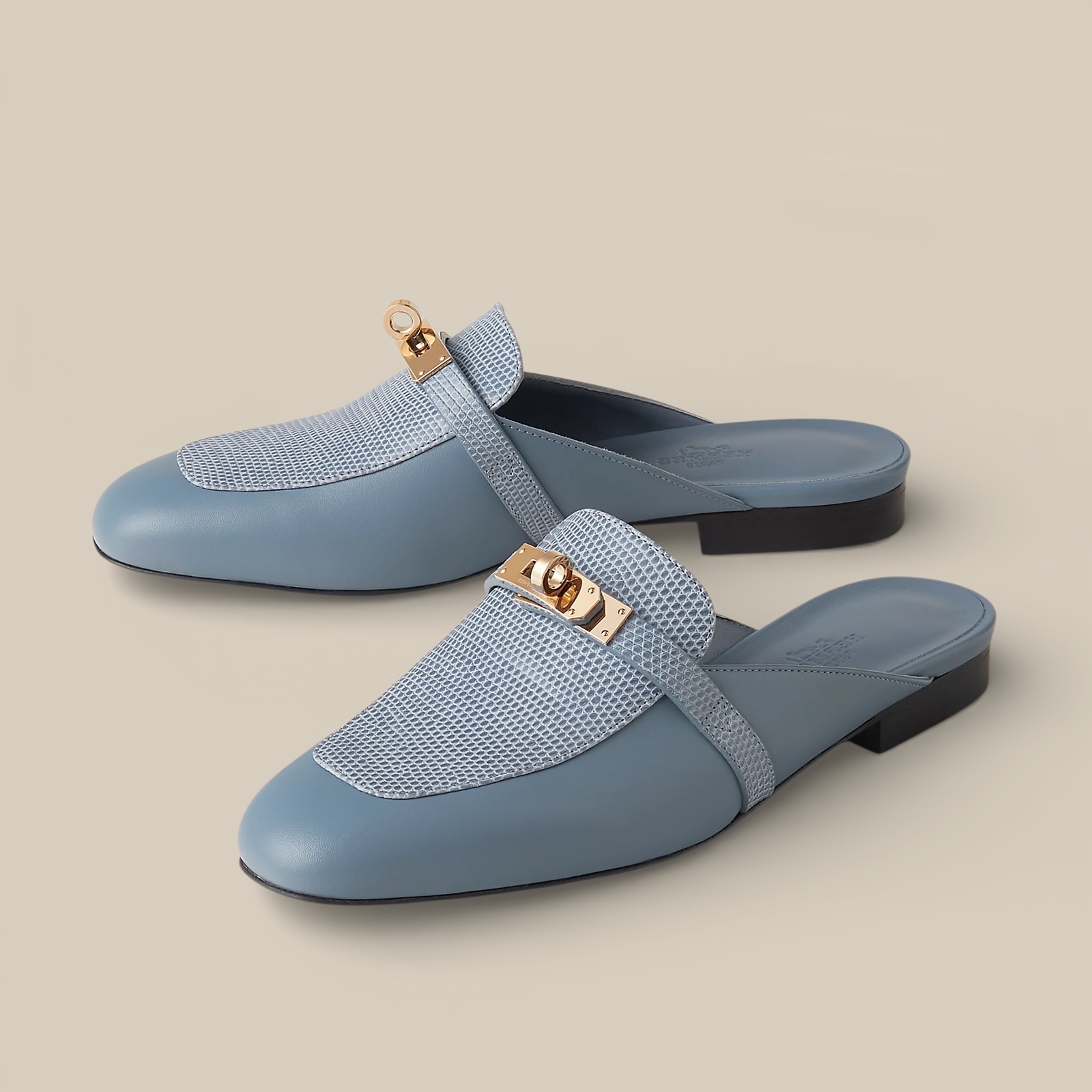 Mule in calfskin and shiny iguana lizard leather with iconic Kelly buckle. For everyday elegance.