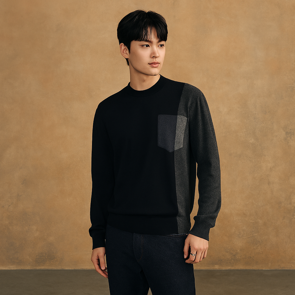 Long-sleeve crewneck sweater in cashmere and cotton with “Poche ombree” detail (71% cashmere, 29% cotton)