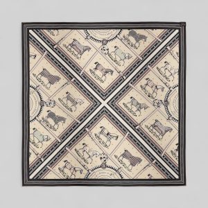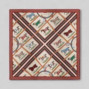 This iconic scarf is an essential part of the history of Hermès, whose primary inspiration has always been horses. It offers us a wonderful glimpse of equestrian style. Elegantly framed by leather bridles, ten horses walking are being fitted as each requires a special outfit. Each fitting depends on their schedule, stable or presentation. Whether you prefer a classic “French-style”, “American-style”, “net-style” blanket, or chain mail cover, Jacques Eudel’s colorful strokes are so realistic and precise that it’s hard to choose.