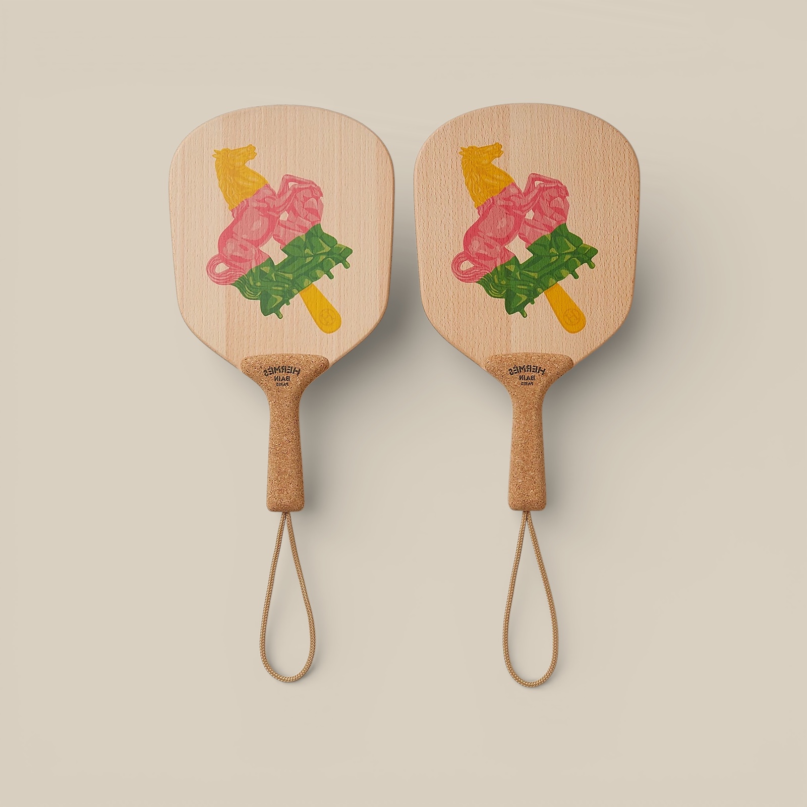 Set of 2 beach rackets in printed beechwood and cork